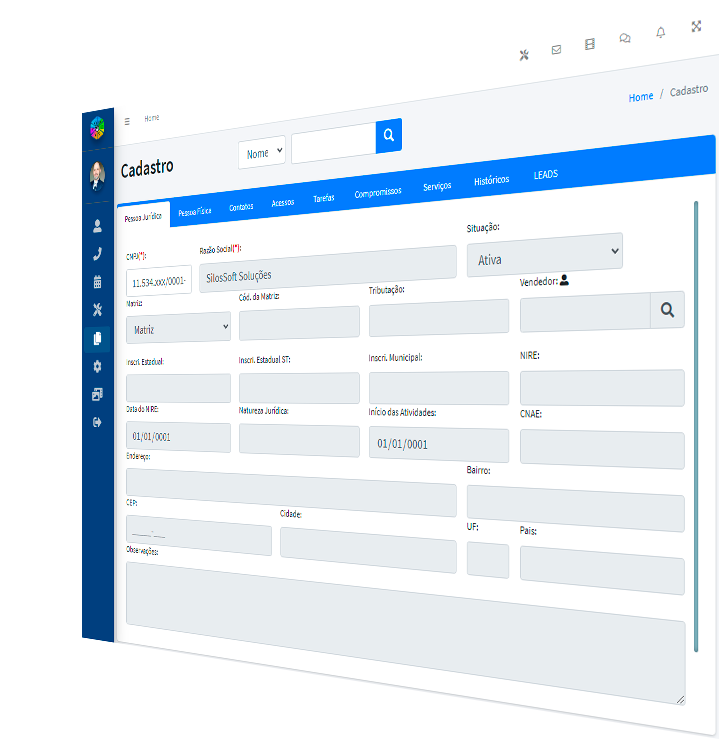 Como CRM básico a plataforma permite fazer o cadastro das empresas Jurídicas e Físicas e associar a mesma os respectivos cadastramento dos contatos.